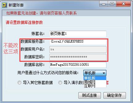 账套名和数据库名称可以修改,访问方式根据实际选择单机版,局域网,互联网。测试连接数据库,提示连接成功,确定保存。提示连接失败请咨询客服。